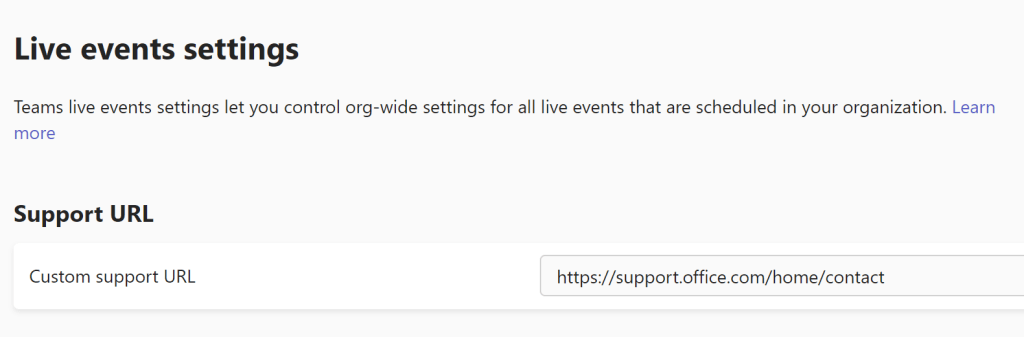 - In the Teams admin center ( Live event settings ) you can customise the support url that is present during the live event. You can redirect this to your url of choice.