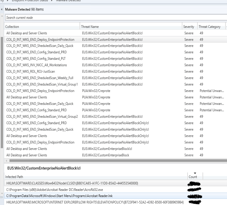 The threat name was identitied as EUS:Win32/CustomEnterpriseNoAlertBlock!cl , more on that later.